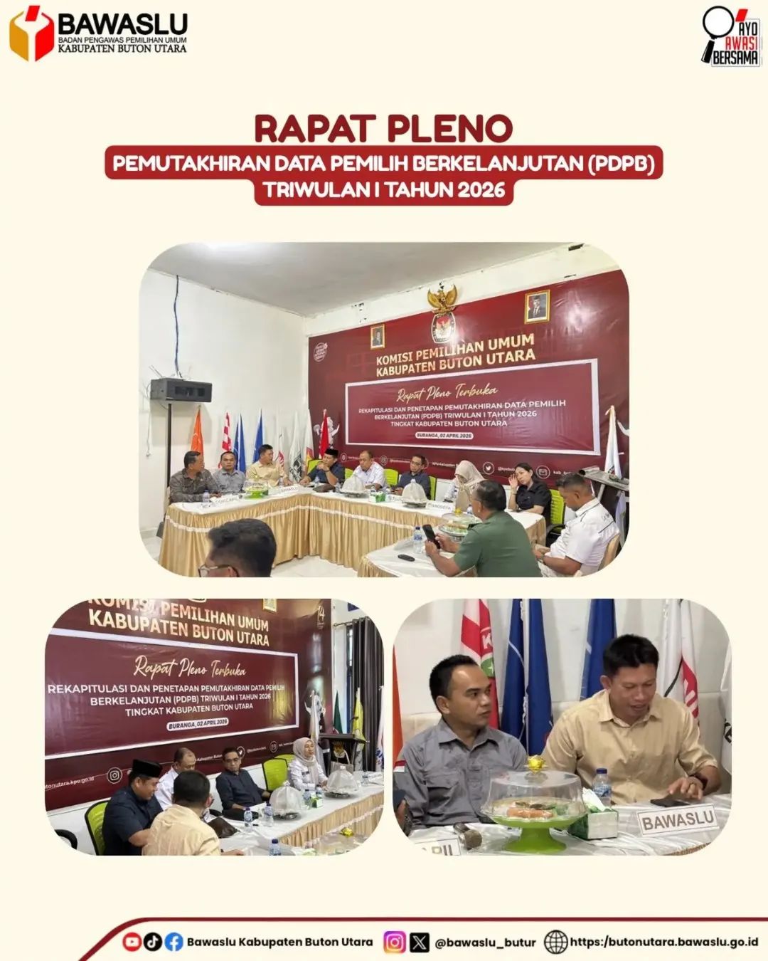 LENSASULTRA.COM-Bawaslu Kabupaten Buton Utara melaksanakan kegiatan pengawasan terhadap Rapat Pleno Terbuka Rekapitulasi dan Penetapan Pemutakhiran Data Pemilih Berkelanjutan (PDPB) Triwulan I Tahun 2026 yang diselenggarakan oleh KPU Kabupaten Buton Utara.